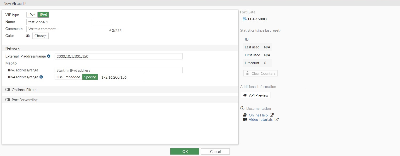 An embedded VIP64 object is used in this configuration so a specific IPv4 mapped IP does not need to be set. The lower 32 bits of the external IPv6 address are used to map to the IPv4 address. Only an IPv6 prefix is defined. In this example, the IPv6 prefix is 2001:10:1:100::, so the IPv6 address 2001:10:1:100::ac10:c89c will be translated to 172.16.200.156.