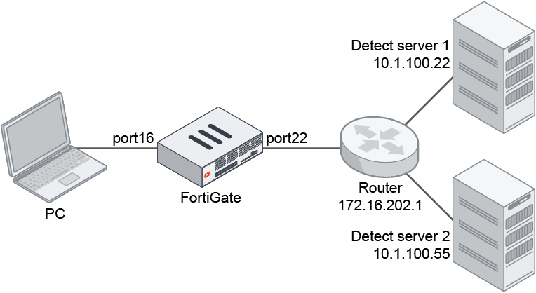 In the following topology, there are two detect servers that connect to the FortiGate through a router: server 1 (10.1.100.22) and server 2 (10.1.100.55).