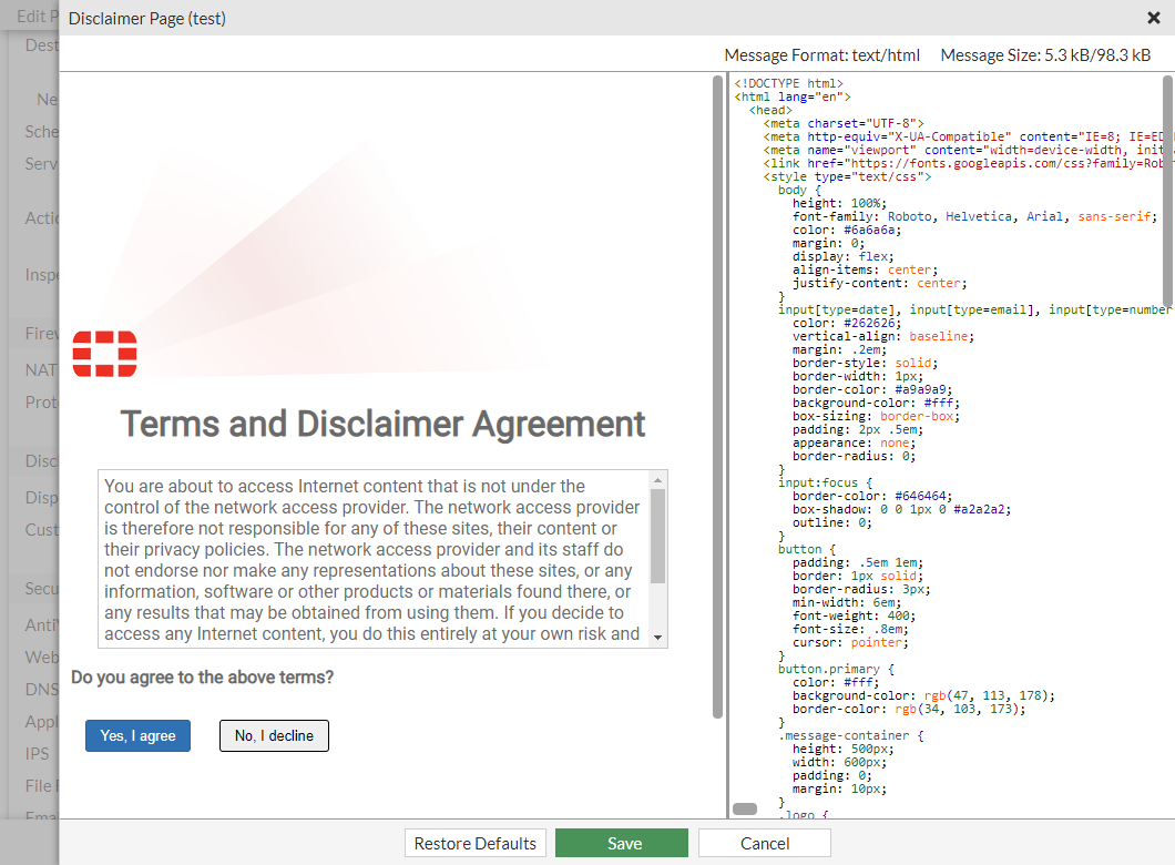 Per-policy custom disclaimers in each VDOM are supported. For example, you may want to configure three firewall policies, each of which matches traffic from endpoints with different FortiClient statuses: