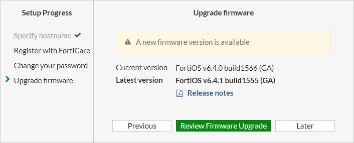 2. Follow the steps in the Setup Progress, then click Review Firmware Upgrade.