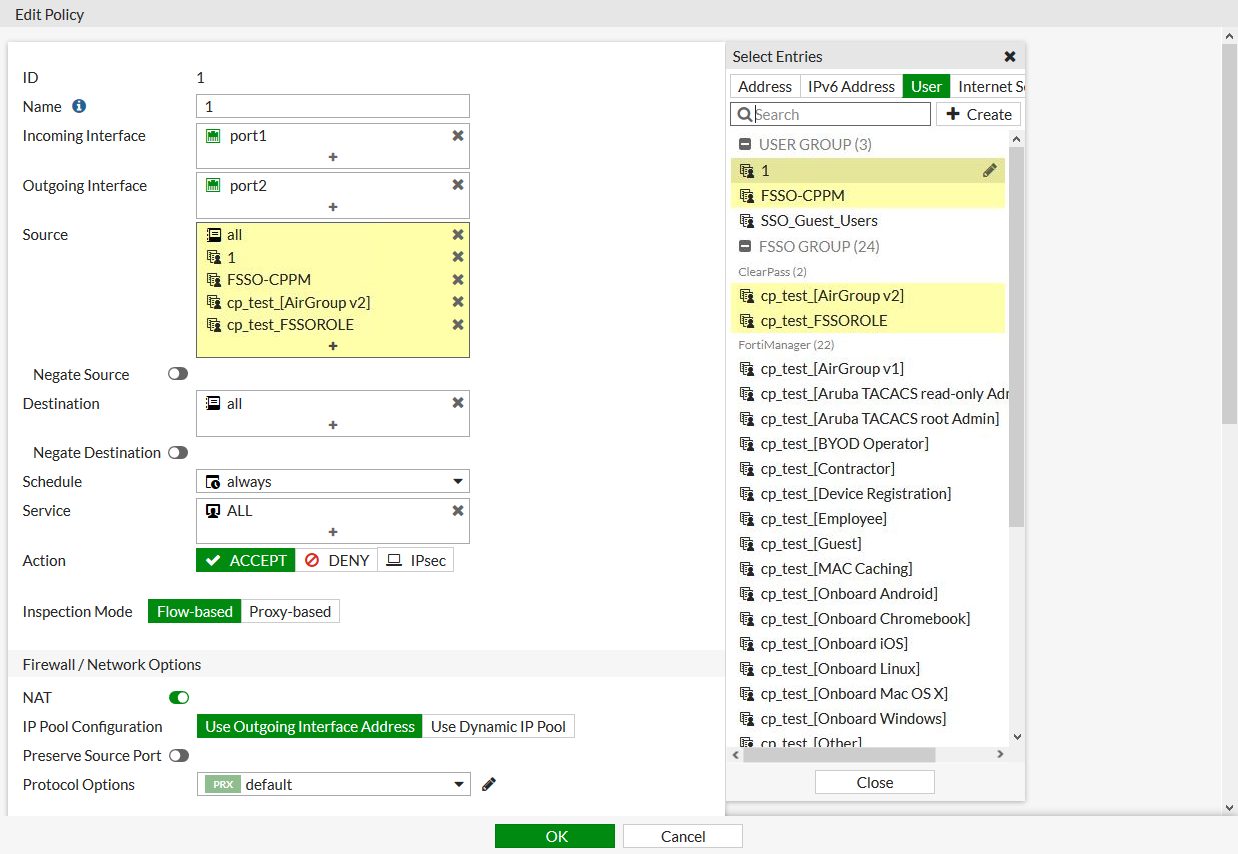In this example, objects learned by the FortiManager from an Aruba ClearPass device are synchronized to the FortiGate. Some of the objects are then added to a group called ClearPass to make them easier to find in the object list when creating a firewall policy.