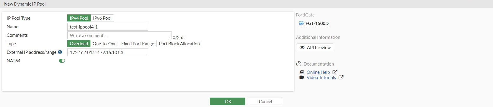 • ippool and ippool6 support NAT46 and NAT64 (when enabled, the IP pool should match a subnet).