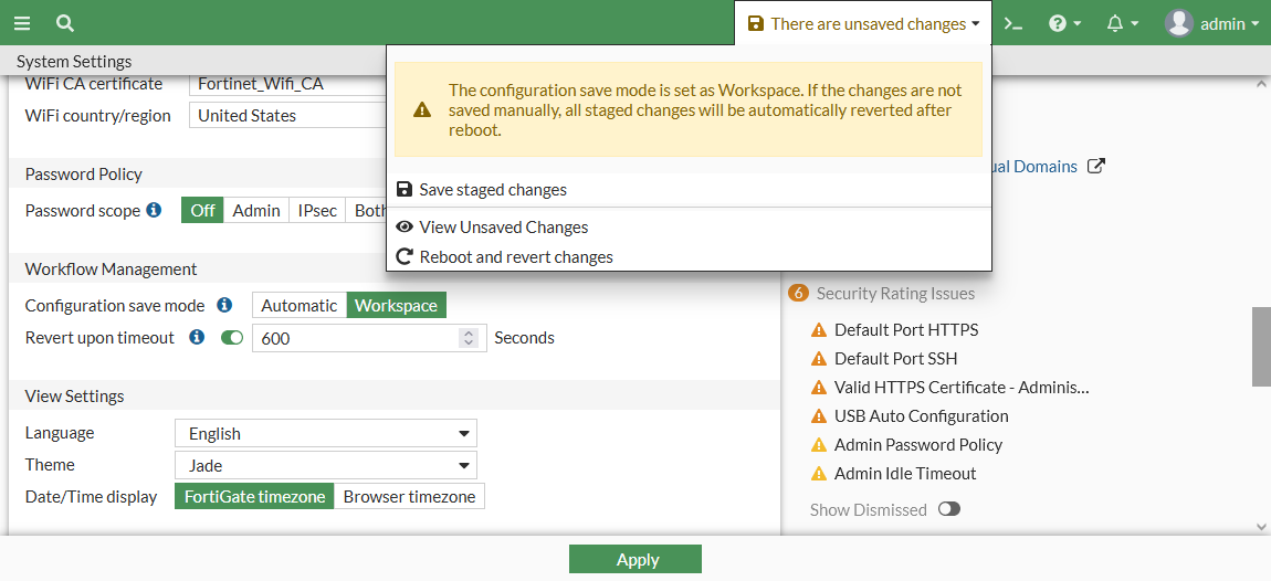 In workspace mode, a warning is shown in the banner when there are unsaved changes. Click the warning to save, view, or revert the changes. When you click Reboot and revert changes, the system might be unresponsive for a short time while it reverts the changes back to the previous save point.