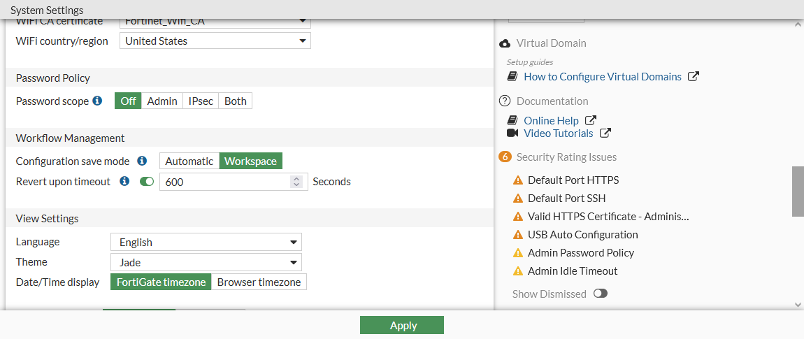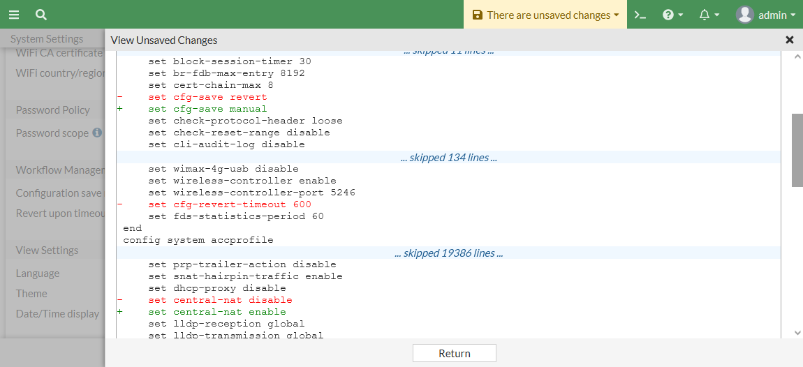 Administrators can use configuration save mode set to Workplace to implement strict change control by requiring changes to be manually committed to the flash. To configure the setting in the GUI, go to System > Settings.
