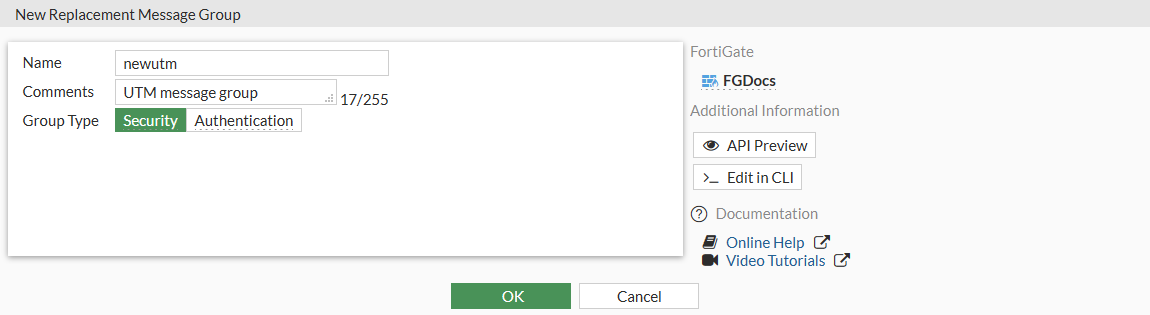 In the following example, two replacement message groups are created. The UTM message group includes custom mail-related messages and is assigned to an email filter profile. The authentication message group has a custom authentication success message that is applied to a proxy-based firewall policy that has an assigned email filter profile.