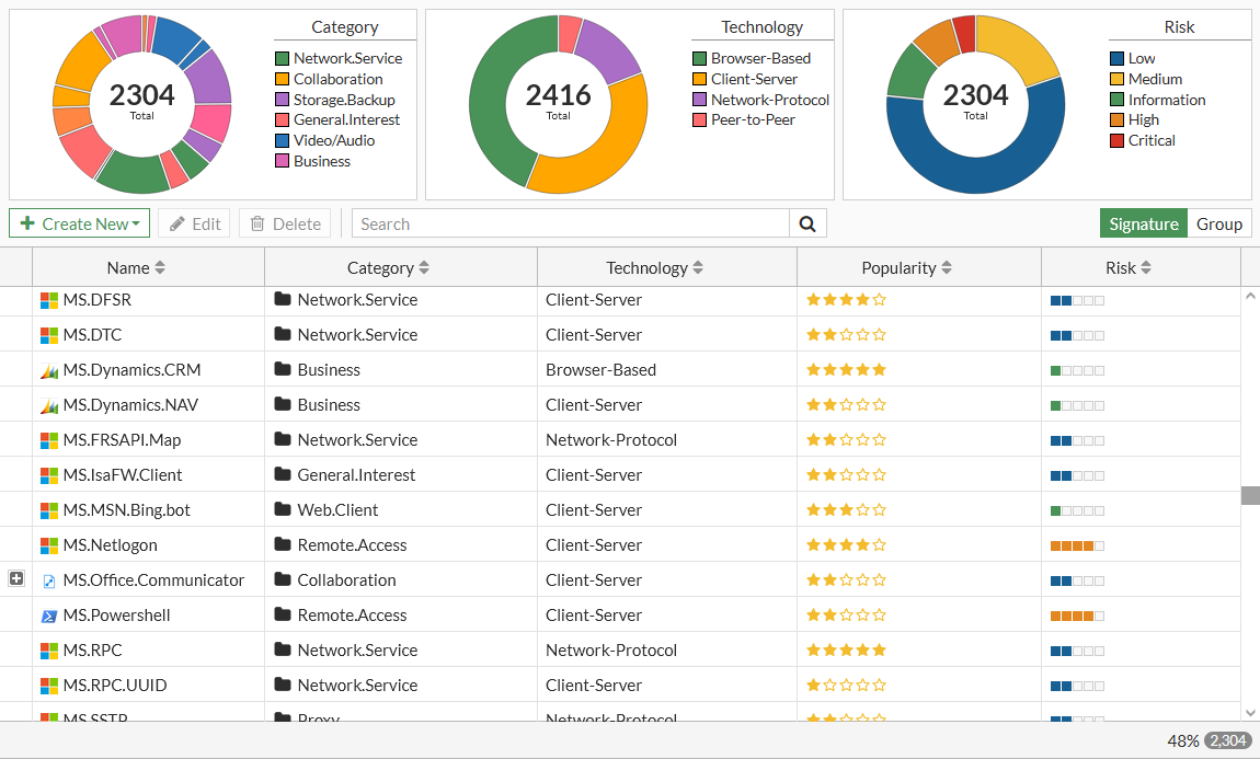 To apply application steering, SD-WAN service rules match traffic based on the applications that are in the application signature database. To view the signatures, go to Security Profiles > Application Signatures and select Signature.