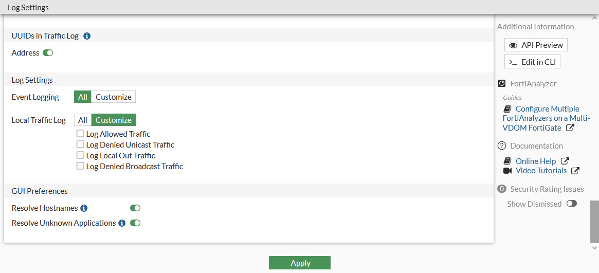 To enable address and policy UUID insertion in traffic logs using the GUI: