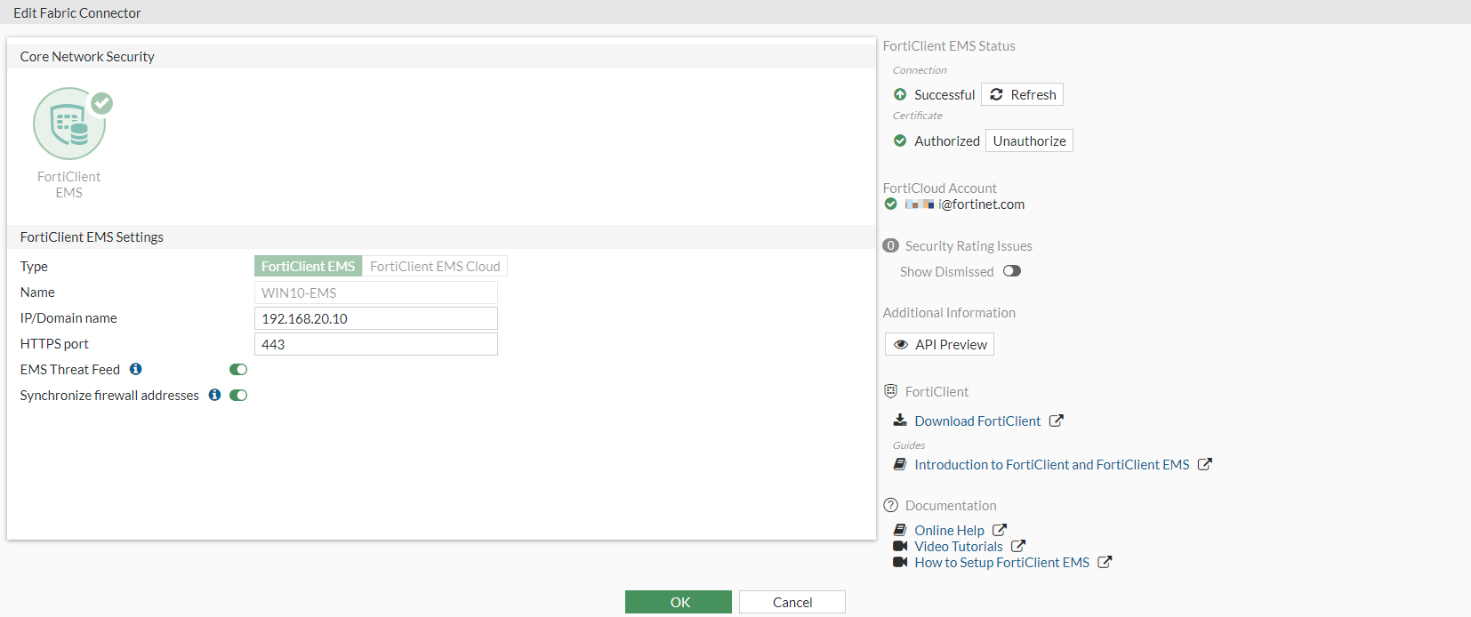 config endpoint-control fctems edit 1 set status enable set name "WIN10-EMS" set server "192.168.20.10" set https-port 443 set pull-sysinfo enable set pull-vulnerabilities enable set pull-avatars enable set pull-tags enable set pull-malware-hash enable set capabilities fabric-auth silent-approval websocket next end - Verify which IPs the dynamic firewall address resolves to: