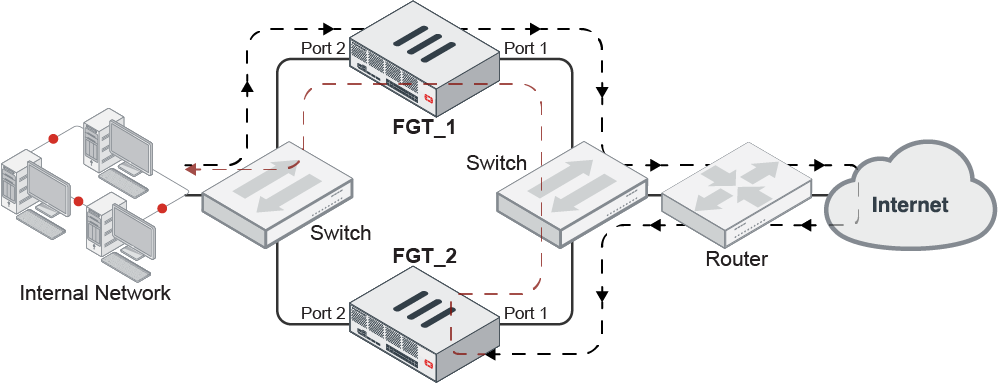 In this example, traffic from the internal network first hits FGT_1, but the return traffic is routed to FGT_2. Consequently, traffic bounces from FGT_2 port1 to FGT_1 port1 using FGT_1’s MAC address. Traffic is then inspected by FGT_1.