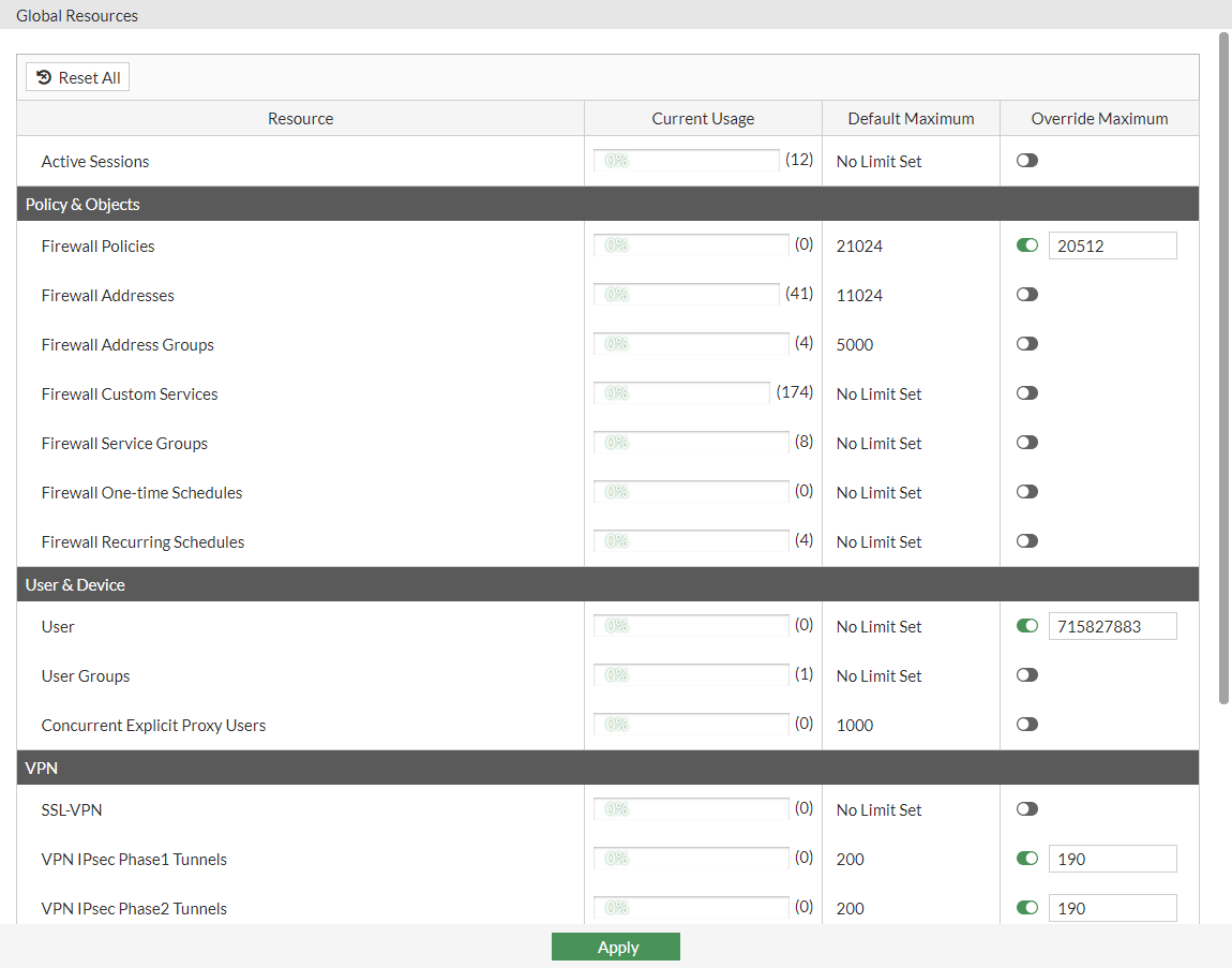 By default, all per-VDOM resource settings are set to have no limits. This means that any single VDOM can use all of the FortiGate device's resources. This could deprive other VDOMs of the resources that they require, to the point that could be unable to function. We recommend settings maximum values on the resources that are vital to you.
