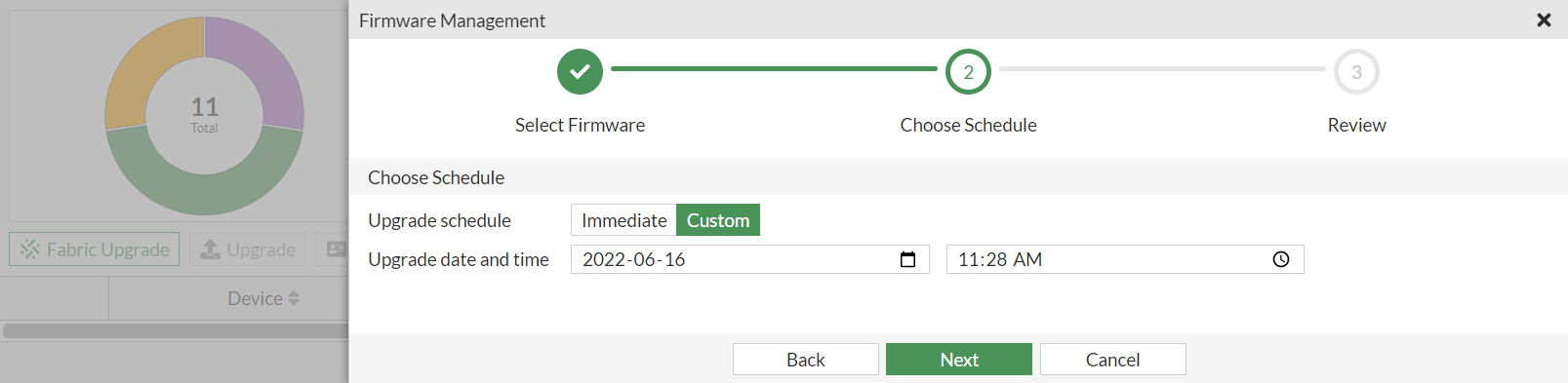 - Click Next and review the update schedule. For the FortiSwitch units, a message appears because no firmware upgrade is currently available.