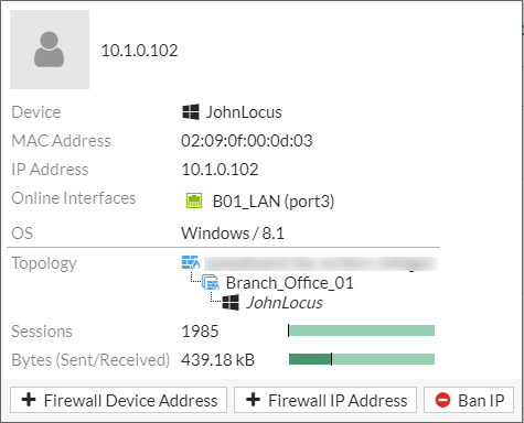 The FortiView Sources monitor displays top sources sorted by Bytes, Sessions or Threat Score. The information can be displayed in real time or historical views. You can use the monitor to create or edit a firewall device address or IP address definitions, and temporarily or permanently ban IPs.