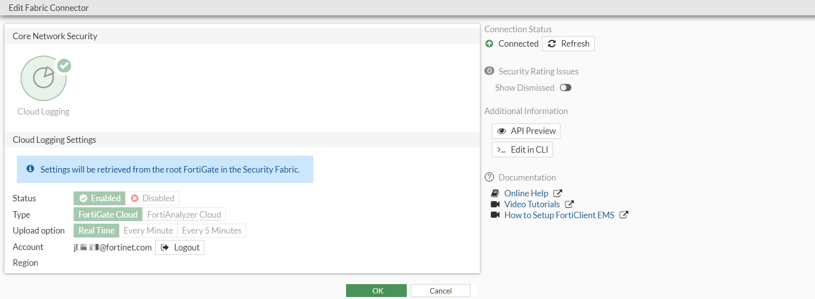 - Go to Security Fabric > Fabric Connectors and double-click the Cloud Logging card. The settings are automatically retrieved from the root and the Account is the same.
