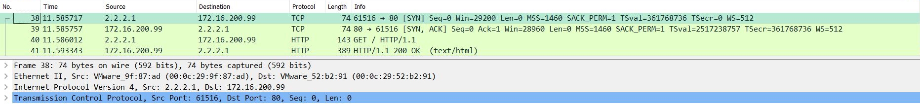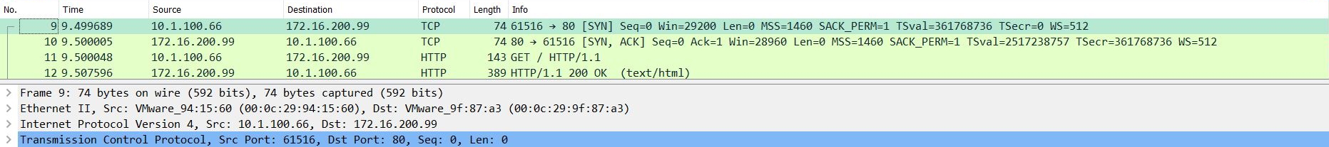 The FortiGate's incoming and outgoing port captures show that HTTP traffic passes through the FortiGate: