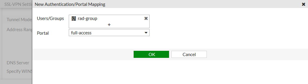 - Click Create New and create a mapping for the rad-group user group with Portal set to full-access.