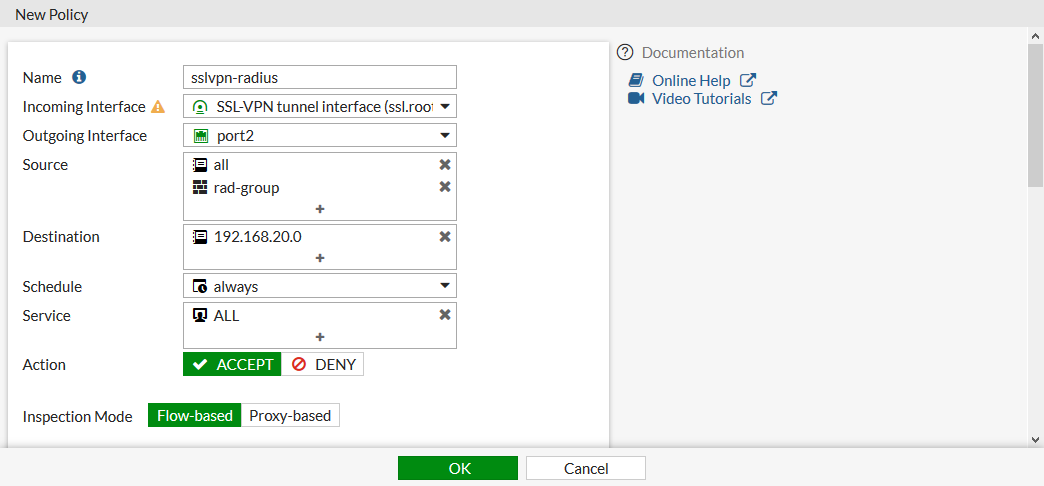 config firewall policy edit 1 set name "sslvpn-radius" set srcintf "ssl.root" set dstintf "port2" set srcaddr "all" set dstaddr "192.168.20.0" set groups “rad-group” set action accept set schedule "always" set service "ALL" set nat enable next end