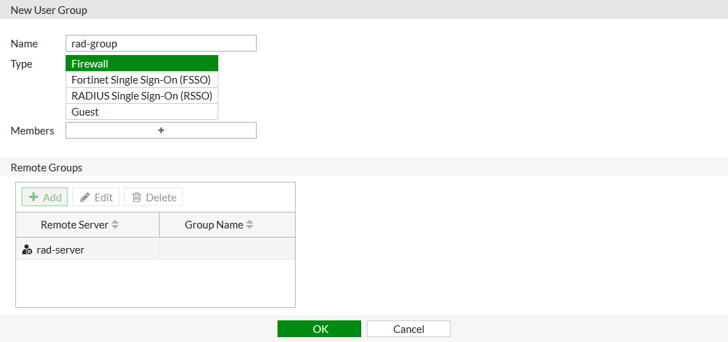 config user radius edit "rad-server" set server "192.168.20.6" set secret ********* next end - Create a user group and add the RADIUS server to it:.