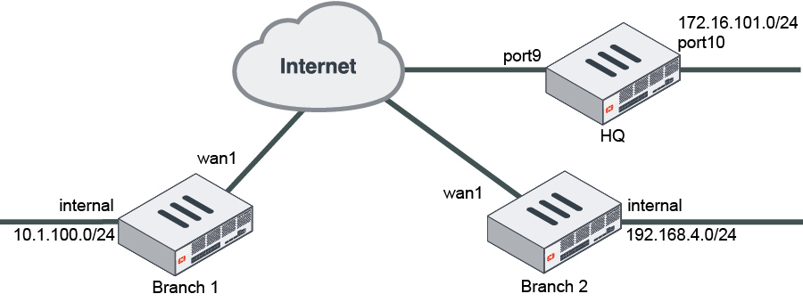 config system interface edit "port9" set alias "WAN" set ip 22.1.1.1 255.255.255.0 next edit "port10" set alias "Internal" set ip 172.16.101.1 255.255.255.0 next end config router static edit 1 set gateway 22.1.1.2 set device "port9" next end - Configure IPsec phase1-interface and phase2-interface configuration at HQ.