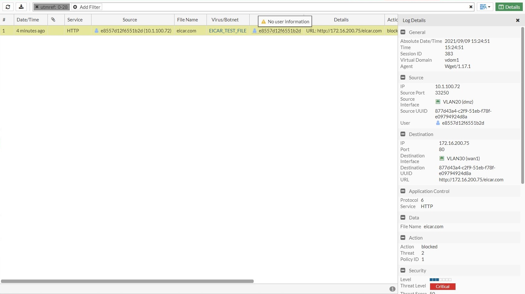 date=2021-09-09 time=15:24:51 eventtime=1631226291945007723 tz="-0700" logid="0211008192" type="utm" subtype="virus" eventtype="infected" level="warning" vd="vdom1" policyid=1 msg="File is infected." action="blocked" service="HTTP" sessionid=383 srcip=10.1.100.72 dstip=172.16.200.75 srcport=33250 dstport=80 srcintf="dmz" srcintfrole="undefined" dstintf="wan1" dstintfrole="undefined" srcuuid="877d43a4-c2f9-51eb-f78f-e09794924d8a" dstuuid="877d43a4-c2f9-51eb-f78f-e09794924d8a" proto=6 direction="incoming" filename="eicar.com" quarskip="File-was-not-quarantined" virus="EICAR_TEST_FILE" viruscat="Virus" dtype="av-engine" ref="http://www.fortinet.com/ve?vn=EICAR_TEST_FILE" virusid=2172 url="http://172.16.200.75/eicar.com" profile="g-default" user="e8557d12f6551b2d" dstuser="e8557d12f6551b2d" agent="Wget/1.17.1" analyticssubmit="false" crscore=50 craction=2 crlevel="critical"