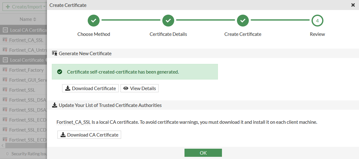 Click Download CA Certificate to download the CA certificate so that it can be installed or imported to all the machines that need to trust this certificate.