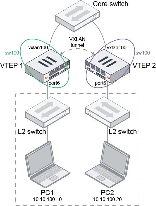 In this example, two FortiGates are configured as VXLAN tunnel endpoints (VTEPs). A VXLAN is configured to allow L2 connectivity between the networks behind each FortiGate. The VXLAN interface and port6 are placed on the same L2 network using a software switch (sw100). An L2 network is formed between PC1 and PC2.
