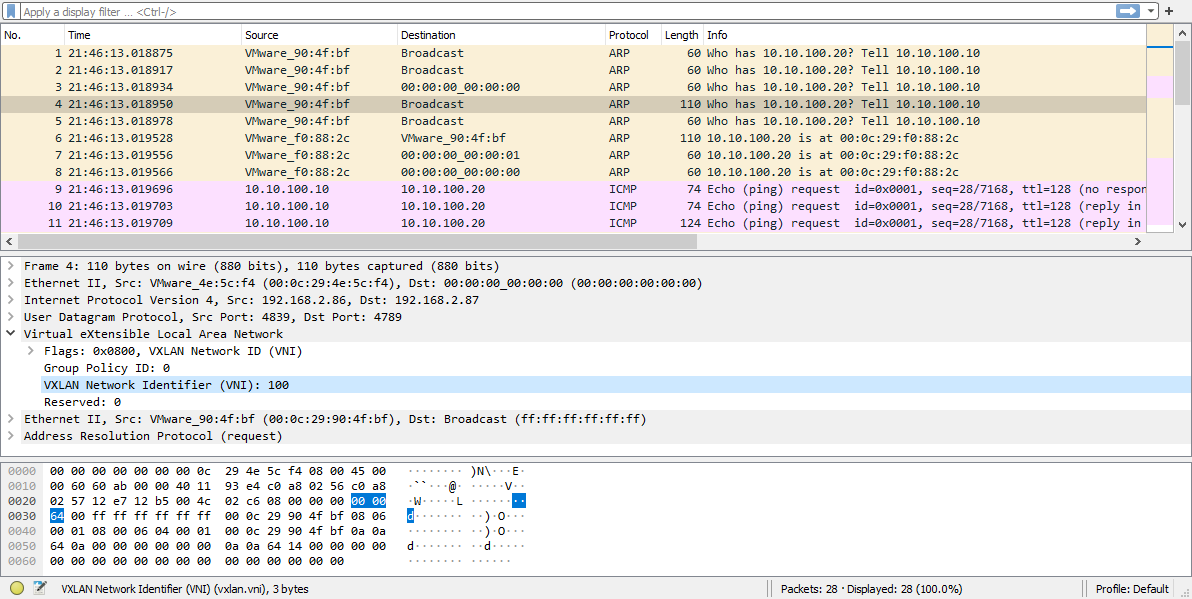 The packet that leaves the physical port2 is encapsulated in UDP and has a VXLAN header with VNI 100 as the identifier. There is an additional 50 B overhead of the UDP encapsulated VXLAN packets as opposed to the unencapsulated packets (for example, packet 4 versus packets 1 and 2).