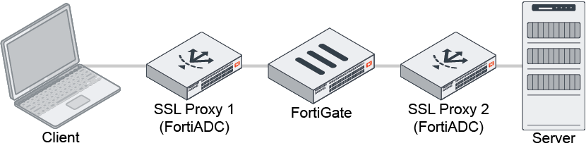 When a FortiGate is sandwiched between SSL encryption and decryption devices, the FortiGate can process the decrypted traffic that passes between those devices. This feature adds support for decrypted traffic in application control. In some pre-defined signatures, the signature is pre-marked with the require_ssl_di tag. The force-inclusion-ssl-di-sigs option under application list allows users to control the inspection of dissected traffic. When this option is enabled, the IPS engine forces the pre-marked SSL-based signatures to be applied to the decrypted traffic of the respective applications. In the following topology, SSL Proxy 1 handles the client connection and SSL Proxy 2 handles the server connection, leaving the content unencrypted as traffic passes through the FortiGate.