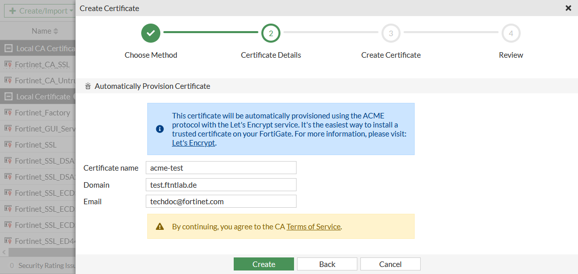The Automated Certificate Management Environment (ACME), as defined in RFC 8555, is used by the public Let's Encrypt certificate authority (https://letsencrypt.org) to provide free SSL server certificates. The FortiGate can be configured to use certificates that are managed by Let's Encrypt, and other certificate management services, that use the ACME protocol. The server certificates can be used for secure administrator log in to the FortiGate.