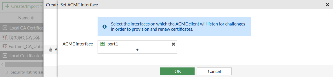 • The configured ACME interface must be public facing so that the FortiGate can listen for ACME update requests. It must not have any VIPs, or port forwarding on port 80 (HTTP) or 443 (HTTPS).