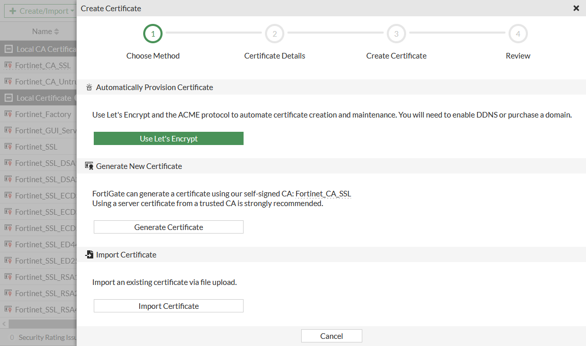 This example shows how to import an ACME certificate from Let's Encrypt, and use it for secured remote administrator access to the FortiGate.