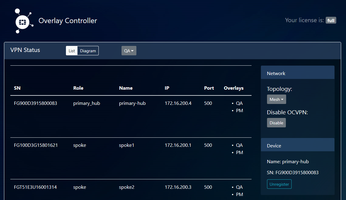 When you log into the OCVPN portal, the OCVPN license type and device information display. The device information includes the device serial number, OCVPN role, hostname, public IP address, port number, and overlays.