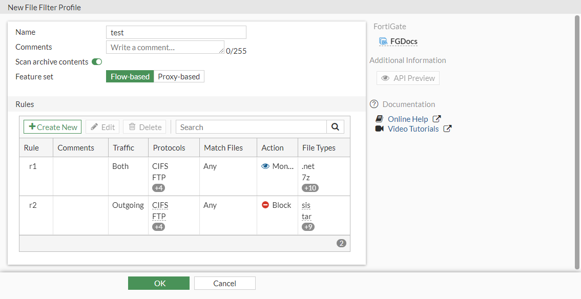 config file-filter profile edit "test" set comment '' set feature-set flow set replacemsg-group '' set log enable set scan-archive-contents enable config rules edit "r1" set comment '' set protocol http ftp smtp imap pop3 cifs set action log-only set direction any set password-protected any set file-type ".net" "7z" "activemime" "arj" "aspack" "avi" "base64" "bat" "binhex" "bmp" "bzip" "bzip2" next edit "r2" set comment '' set protocol http ftp smtp imap pop3 cifs set action block set direction outgoing set password-protected any set file-type "sis" "tar" "tiff" "torrent" "upx" "uue" "wav" "wma" "xar" "xz" "zip" next end next end - Apply the filter to a policy: