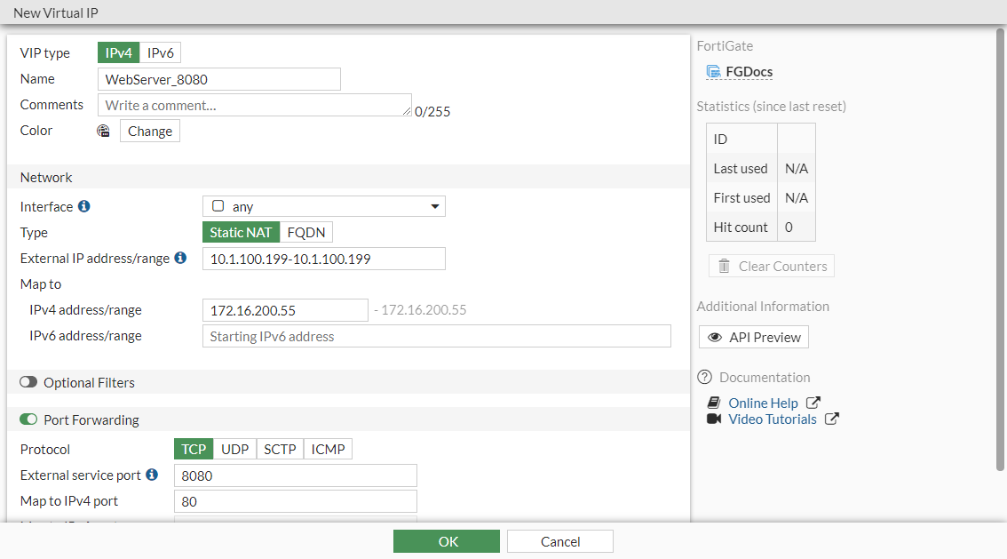 - Access 10.1.100.199:8080 from external network and FortiGate maps to 172.16.200.55:80 in internal network.