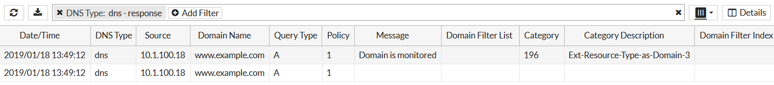 1: date=2019-01-18 time=13:49:12 logid="1501054802" type="utm" subtype="dns" eventtype="dns-response" level="notice" vd="vdom1" eventtime=1547848151 policyid=1 sessionid=82998 srcip=10.1.100.18 srcport=42985 srcintf="port10" srcintfrole="undefined" dstip=172.16.95.16 dstport=53 dstintf="port9" dstintfrole="undefined" proto=17 profile="default" xid=38234 qname="www.example.com" qtype="A" qtypeval=1 qclass="IN" ipaddr="93.184.216.34" msg="Domain is monitored" action="pass" cat=196 catdesc="Ext-Resource-Type-as-Domain-3" 2: date=2019-01-18 time=13:49:12 logid="1500054000" type="utm" subtype="dns" eventtype="dns-query" level="information" vd="vdom1" eventtime=1547848151 policyid=1 sessionid=82998 srcip=10.1.100.18 srcport=42985 srcintf="port10" srcintfrole="undefined" dstip=172.16.95.16 dstport=53 dstintf="port9" dstintfrole="undefined" proto=17 profile="default" xid=38234 qname="www.example.com" qtype="A" qtypeval=1 qclass="IN"