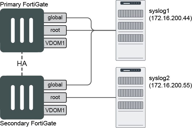 In an HA cluster, secondary devices can be configured to use different FortiAnalyzer devices and syslog servers than the primary device. VDOMs can also override global syslog server settings.