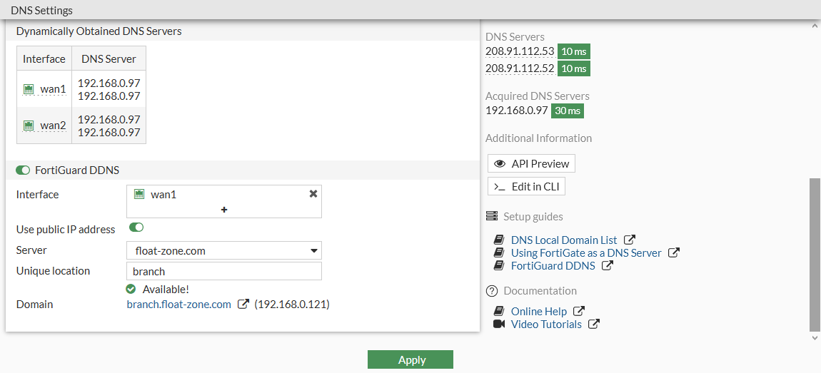 In this example, FortiGuard DDNS is enabled and the DDNS server is set to float-zone.com. Other DDNS server options include fortiddns.com and fortidyndns.com.
