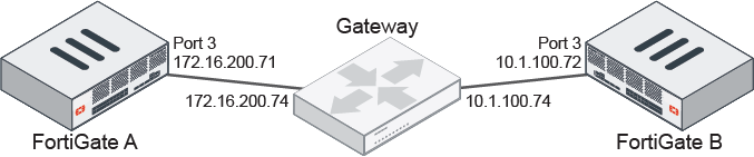 In this example, two FortiGates in different subnets are connected through a unicast gateway. Both cluster members use the same port for the heartbeat interface.
