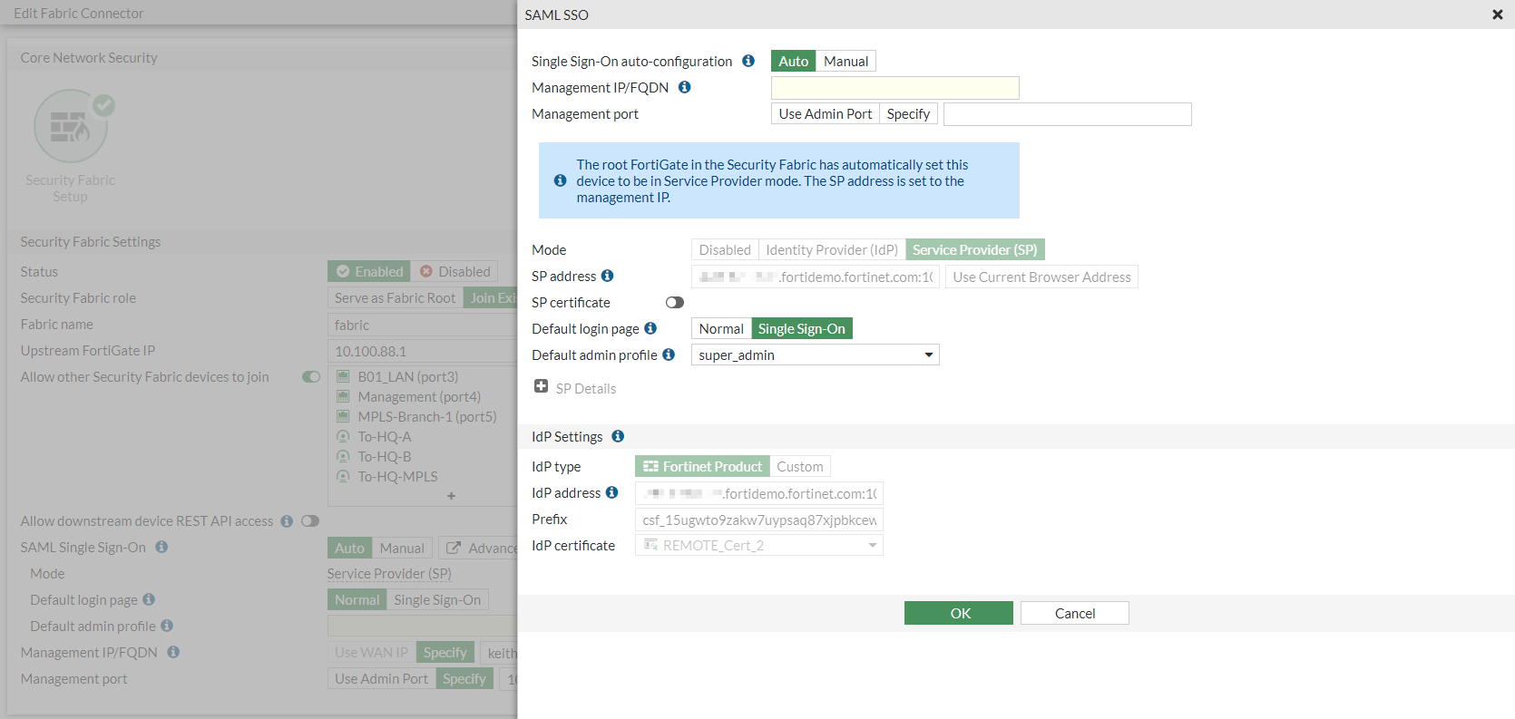 - On the IdP, go to Security Fabric > Fabric Connectors and double-click the Security Fabric Setup card.