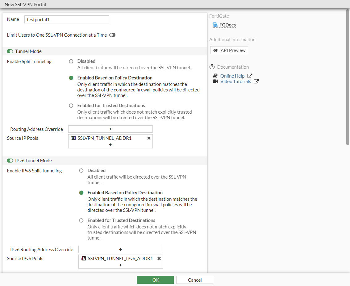 config vpn ssl web portal edit "testportal1" set tunnel-mode enable set ipv6-tunnel-mode enable set web-mode enable set ip-pools "SSLVPN_TUNNEL_ADDR1" set ipv6-pools "SSLVPN_TUNNEL_IPv6_ADDR1" set split-tunneling enable set ipv6-split-tunneling enable next end -