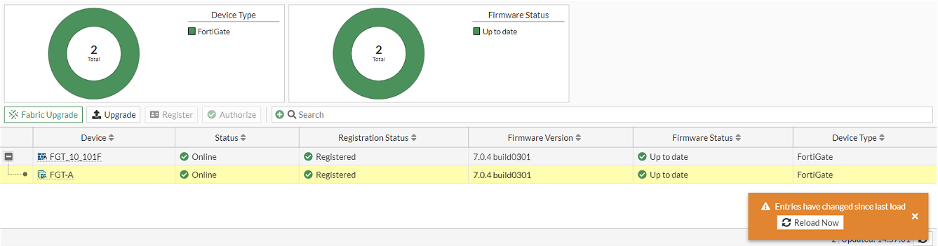 With the WebSocket for Security Fabric events, subscribers to the WebSocket (such as the Fabric Management page) are updated upon new Fabric events and alert users to reload the page.