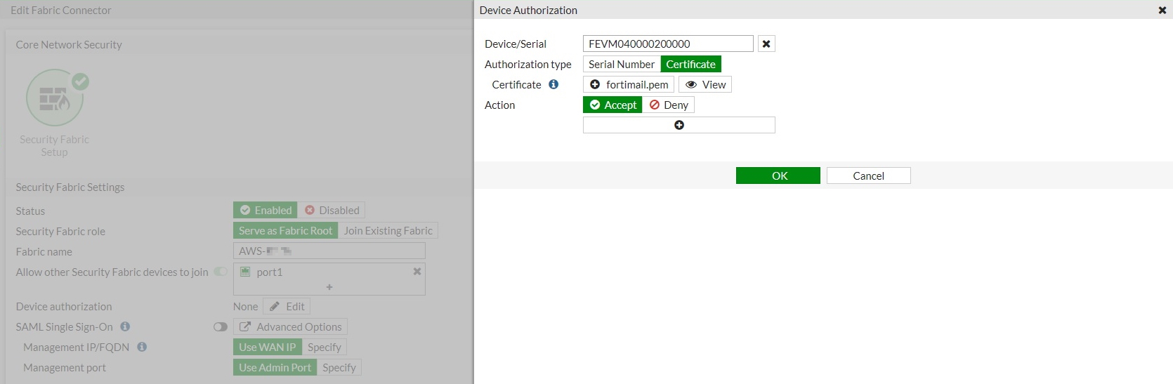 FortiMail can be pre-authorized using its serial number or certificate. When you pre-authorize, the FortiMail can join at any time, and you will not need to authorize it FortiOS. In this example, FortiMail is pre-authorized using a certificate.