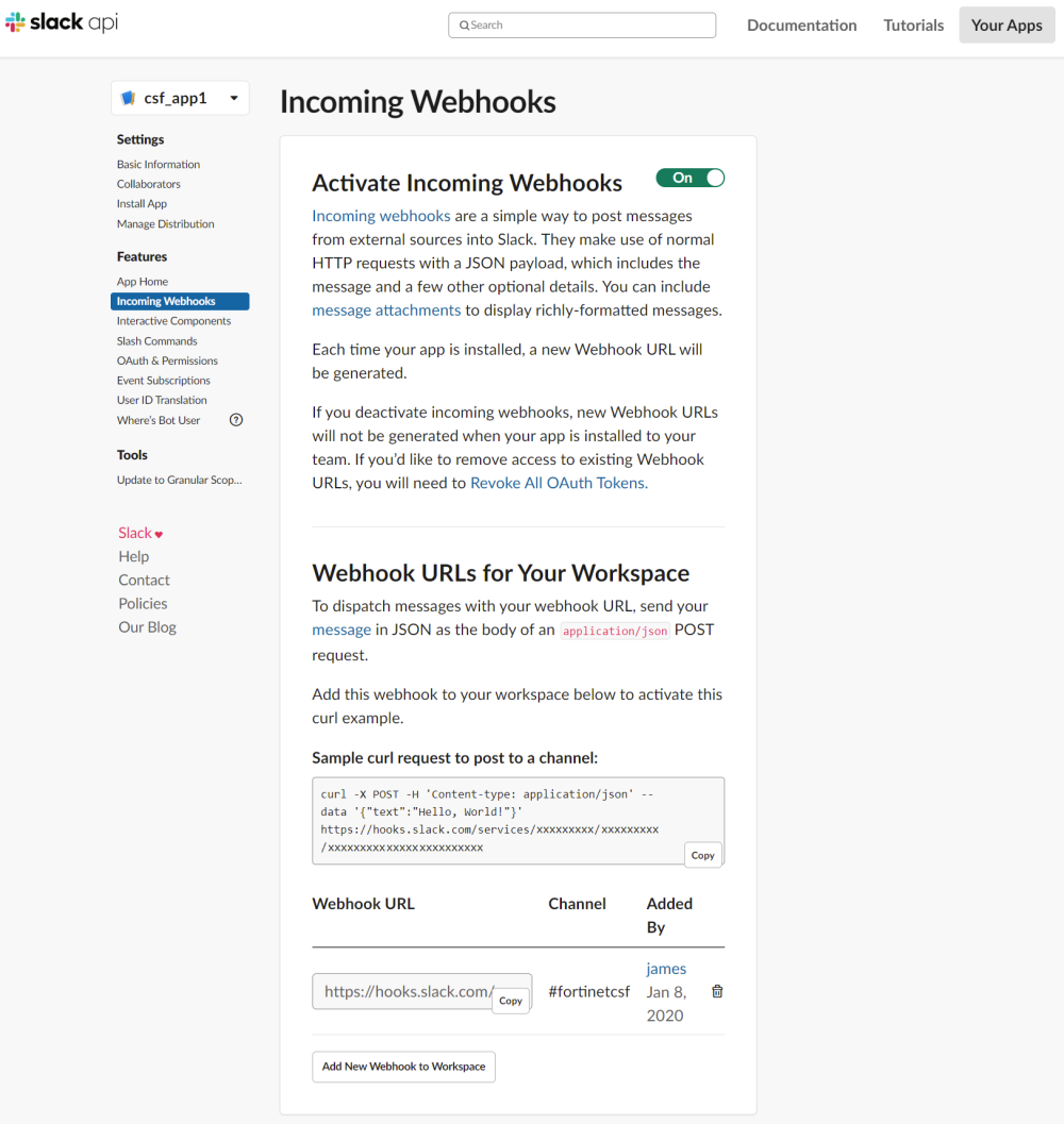 - Add an Incoming Webhook to a channel in the workspace (see Sending messages using Incoming Webhooks for more details).