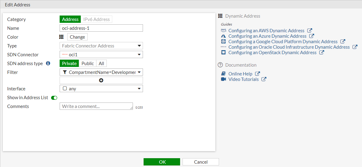 config firewall address edit "oci-address-1" set type dynamic set sdn "oci1" set filter "CompartmentName=DevelopmentEngineering" next end
