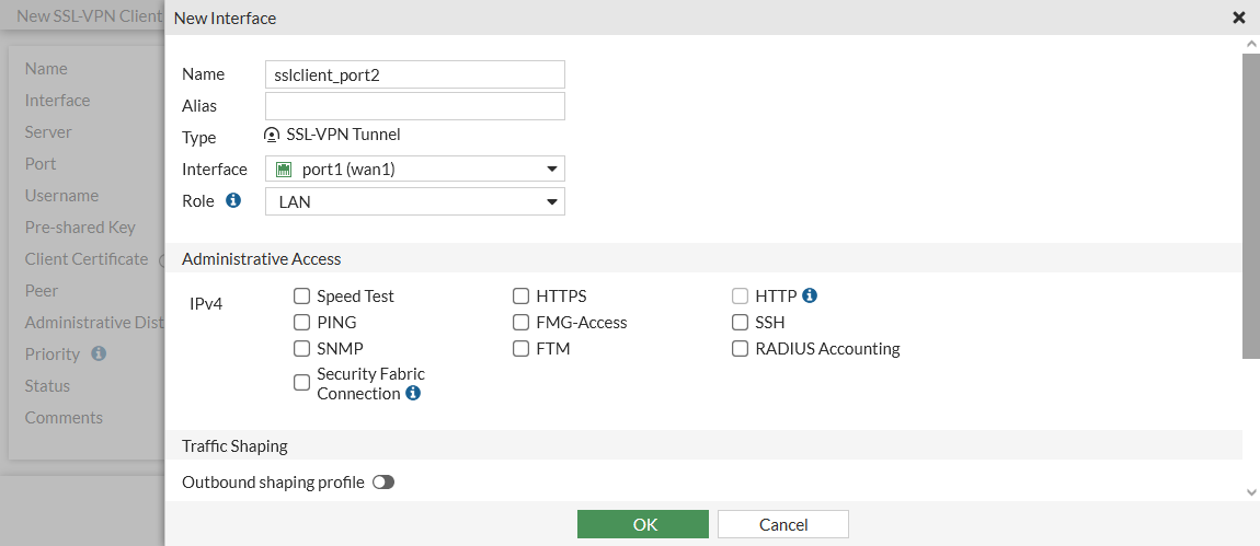 config system interface edit "sslclient_port2" set vdom "vdom1" set type ssl set role lan set snmp-index 46 set interface "port2" next end -