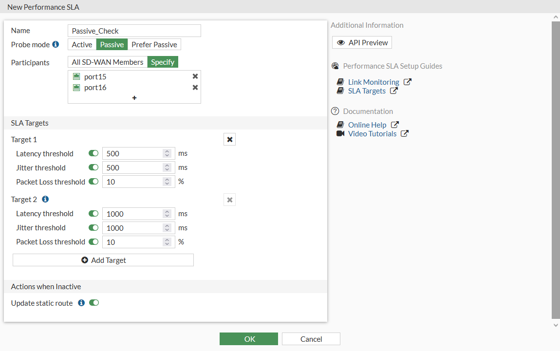 By default, active WAN health measurement is enabled when a new health check is created. It can be changed to passive or prefer passive: