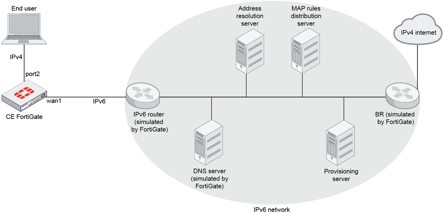 On a customer edge (CE) FortiGate, an IPv4-over-IPv6 (MAP-E) tunnel can be created between the FortiGate and the border relay (BR) operating in an IPv6 network. A tunnel interface is created between the FortiGate and BR, which can be applied to firewall policies and IPsec VPN.