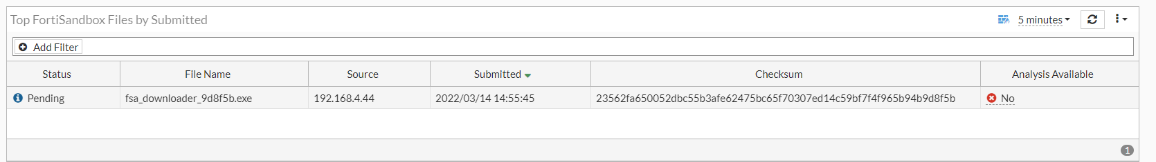 - Go to Dashboard > Top FortiSandbox Files. The entry appears in the table, but the analysis is not available yet.