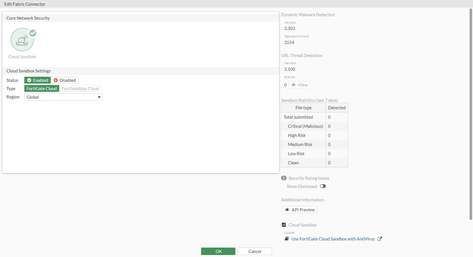 - Go to Security Fabric > Fabric Connectors and double-click the Cloud Sandbox card.