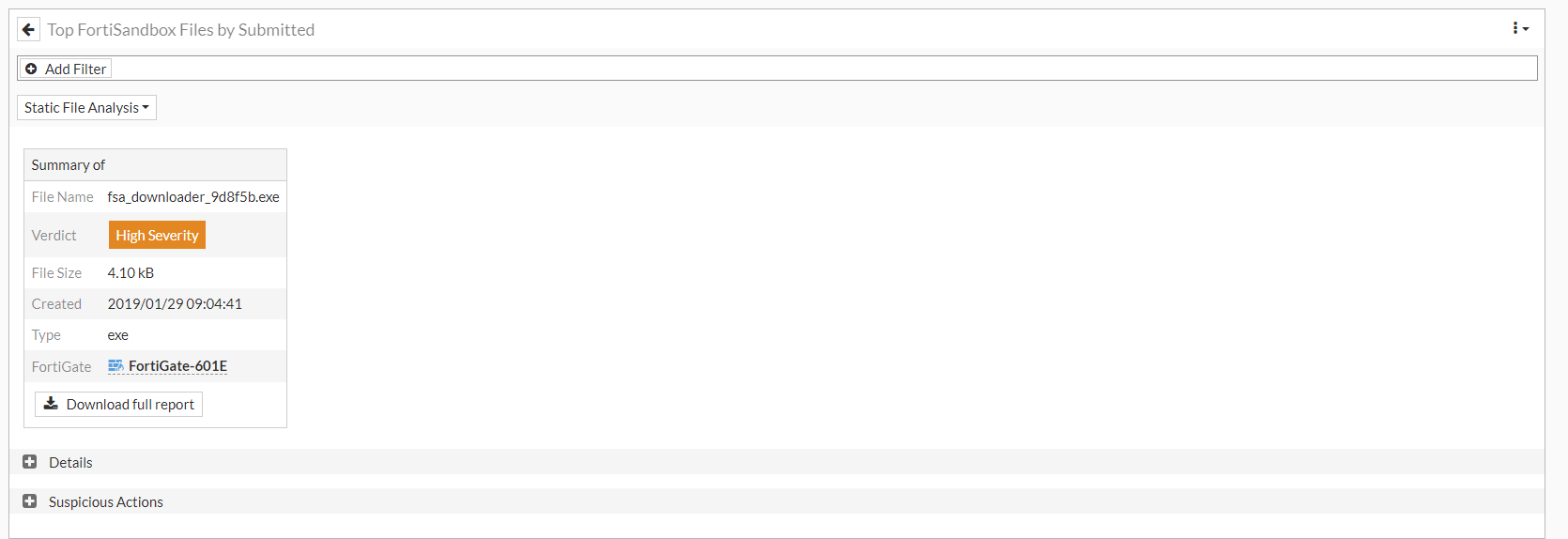 In the Top FortiSandbox Files FortiView monitor, users can select a submitted file and drill down to view its static and dynamic file analysis. The full FortiSandbox report can be downloaded in PDF format. This feature works with FortiGate Cloud Sandbox, FortiSandbox Cloud, and FortiSandbox appliance. FortiSandbox must be running version 3.2.1 and later.