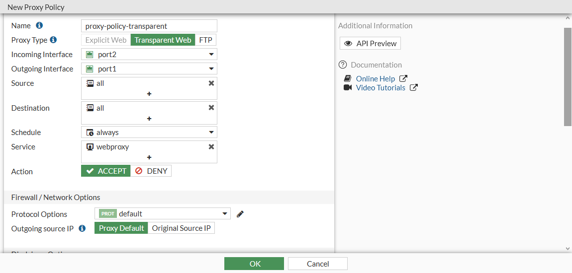 Set Proxy Type to Transparent Web, set the Incoming Interface to port2, and set the Outgoing Interface to port1.